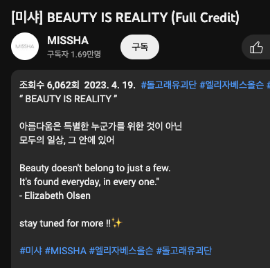 한 달 전부터 여기저기 '미샤MISSHA' 광고가 많이 보입니다. 그런데 무려 모델이 마블 유니버스에서 스칼렛위치 역할로 잘 알려진 '엘리자베스 올슨Elizabeth Olsen' 입니다.